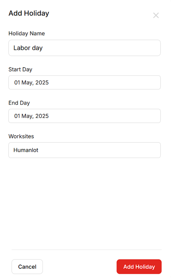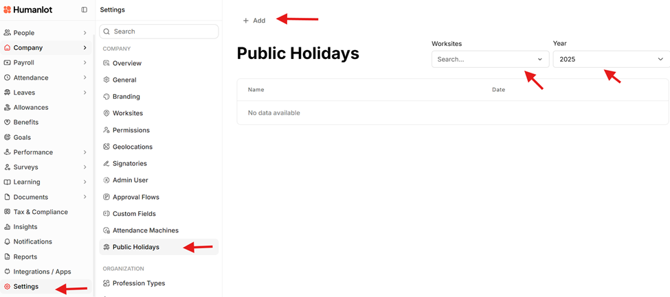 Adding public holidays ensures that leave and attendance calculations reflect official non-working days accurately.