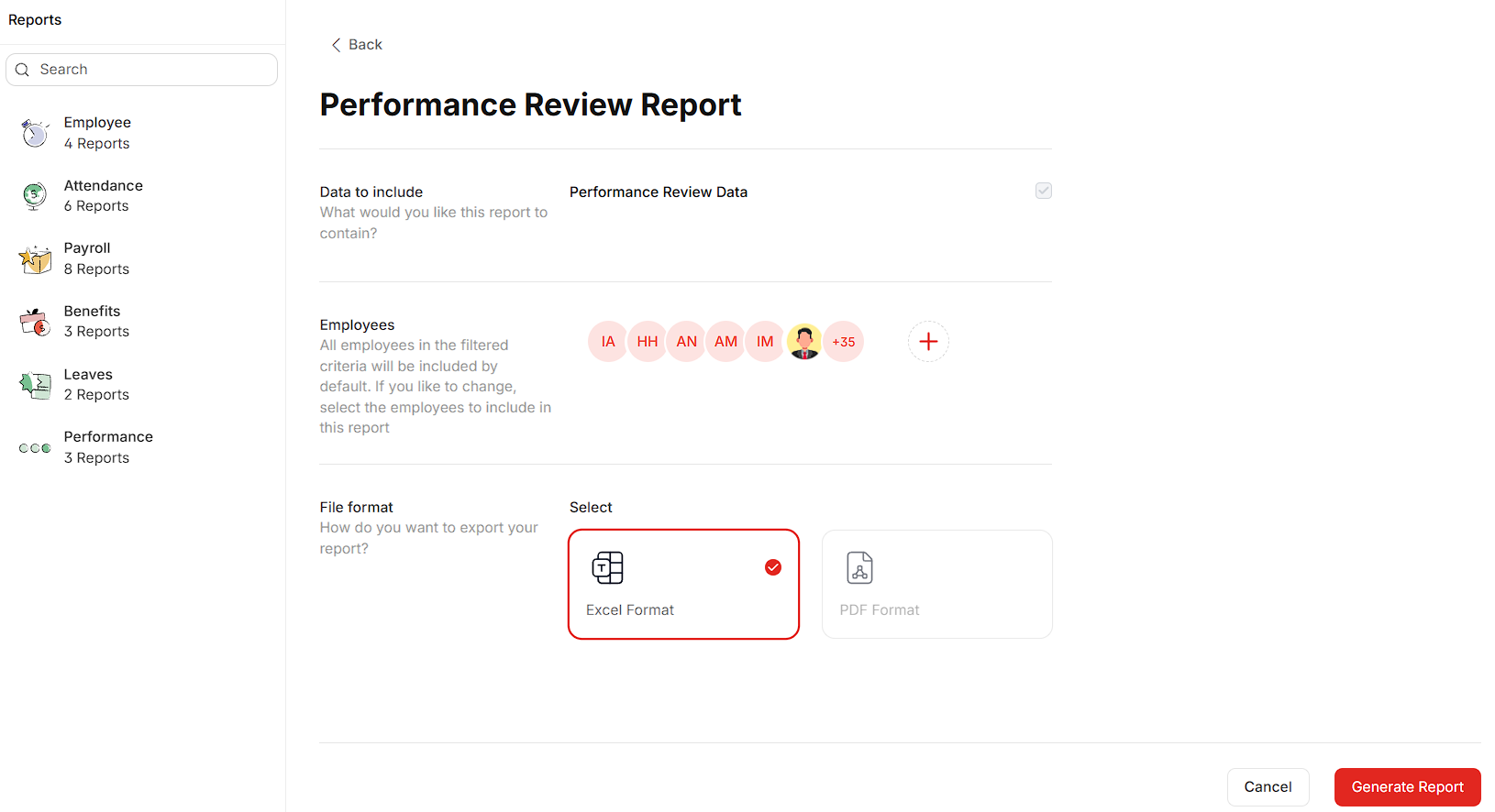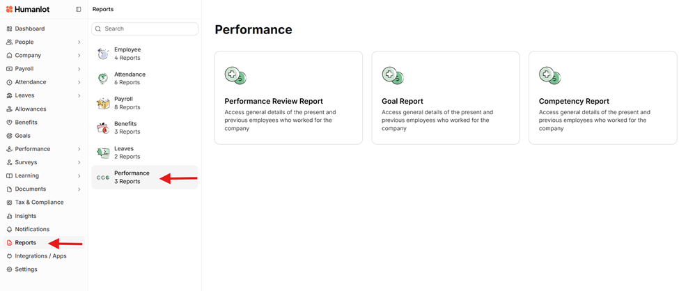 Performance reports provide insights into employee evaluations and help track progress across teams or departments.