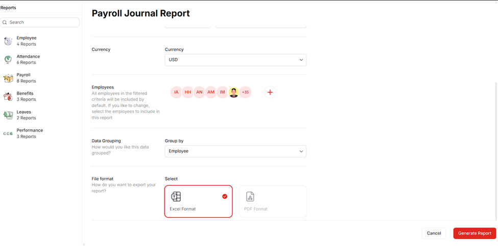 Pick how you want the data to be grouped (e.g., Employee, Designation, Department, Nationality).