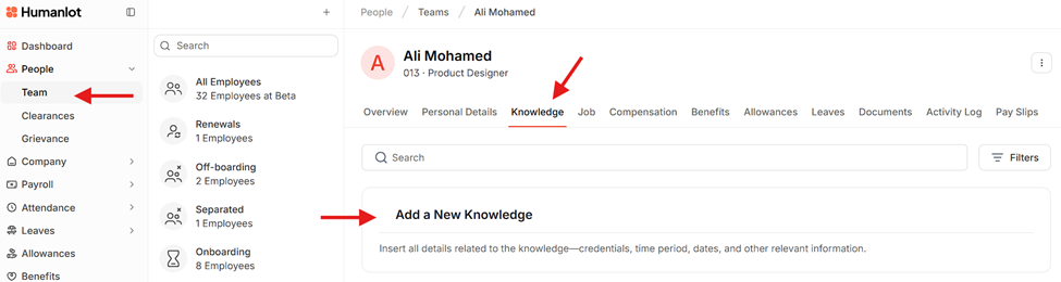 Adding knowledge records such as qualifications and training helps keep employee profiles up to date with their skills and certifications.