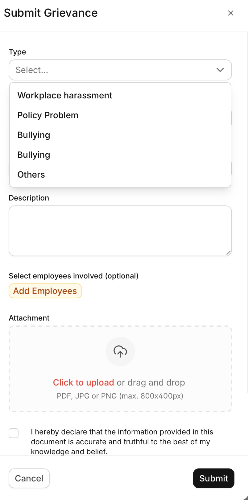 Step 3: If the employee wants to submit an anonymous grievance, make sure to toggle on the "share anonymously" button
