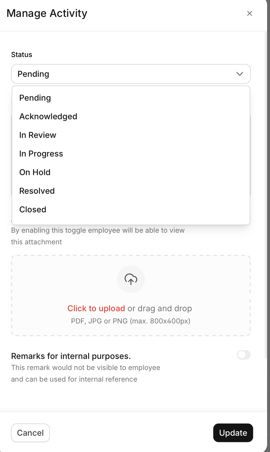 Step 4: You can also attach any images or PDF using the "manage activity" button for the case