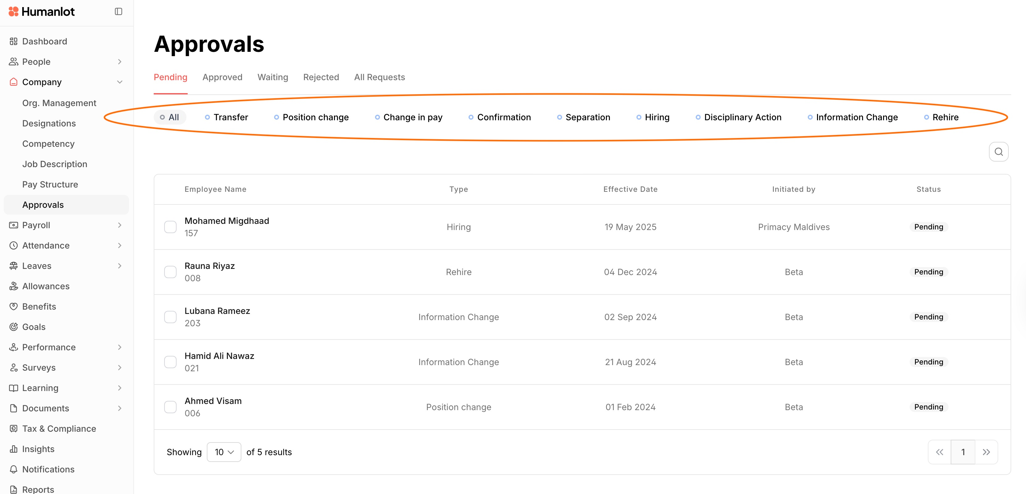 Movements such as Transfer, Position Change, Confirmation, Disciplinary Action, and others initiated from People > Team > Employee Profile must be approved through the Company Approvals process.